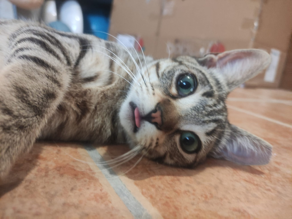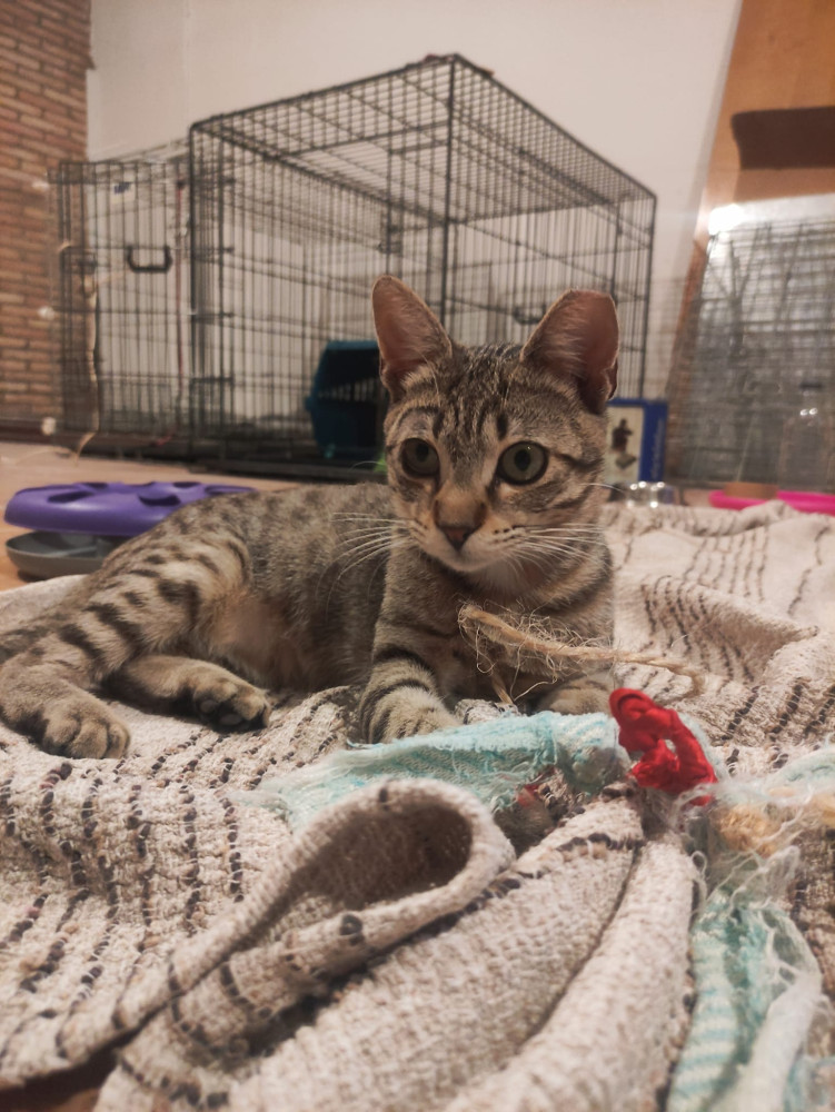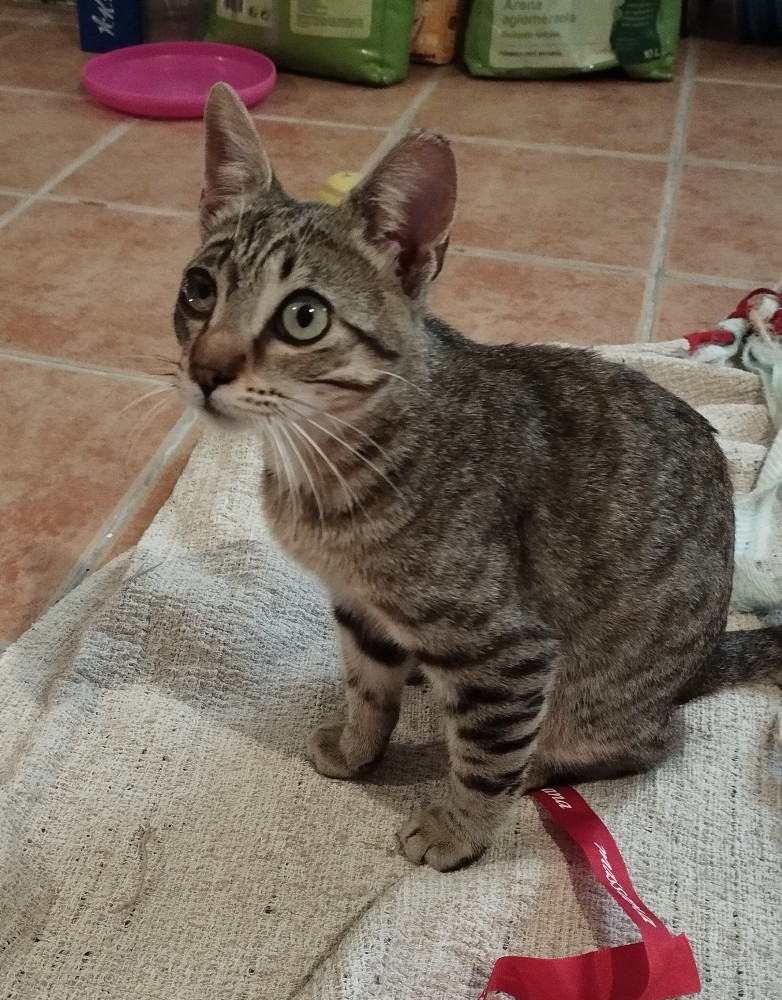 Le encantan los mimos y jugar con su juguete preferido: un cordón. Es muy listo y siempre está de buen humor.
